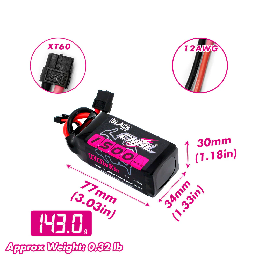 Incluye: 1 batería LiPo CNHL 1500mAh 11.1V 3S 100C con conector XT60. La CNHL 1500mAh 11.1V 3S 100C es una opción confiable y poderosa para quienes buscan el mejor equilibrio entre potencia, ligereza y durabilidad en sus vuelos FPV. Perfecta para freestyle, carreras o cinewhoop.